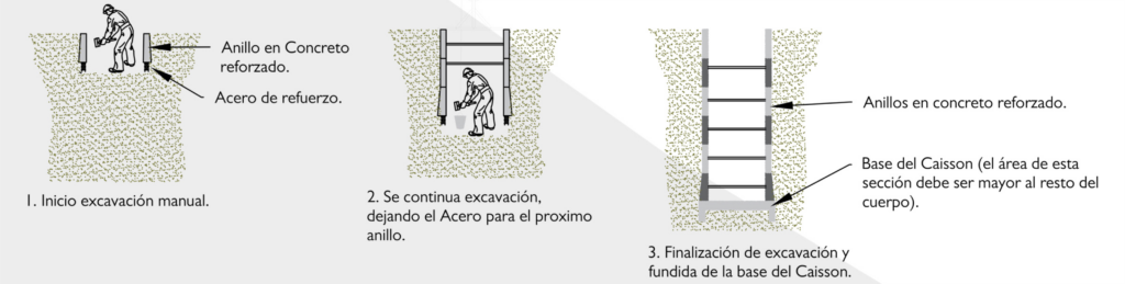 Son elementos estructurales circulares o rectangulares, construidos in situ mediante la excavación progresiva y vertido de anillos de concreto reforzado, permiten transferir cargas de la estructura y superestructura al terreno natural.