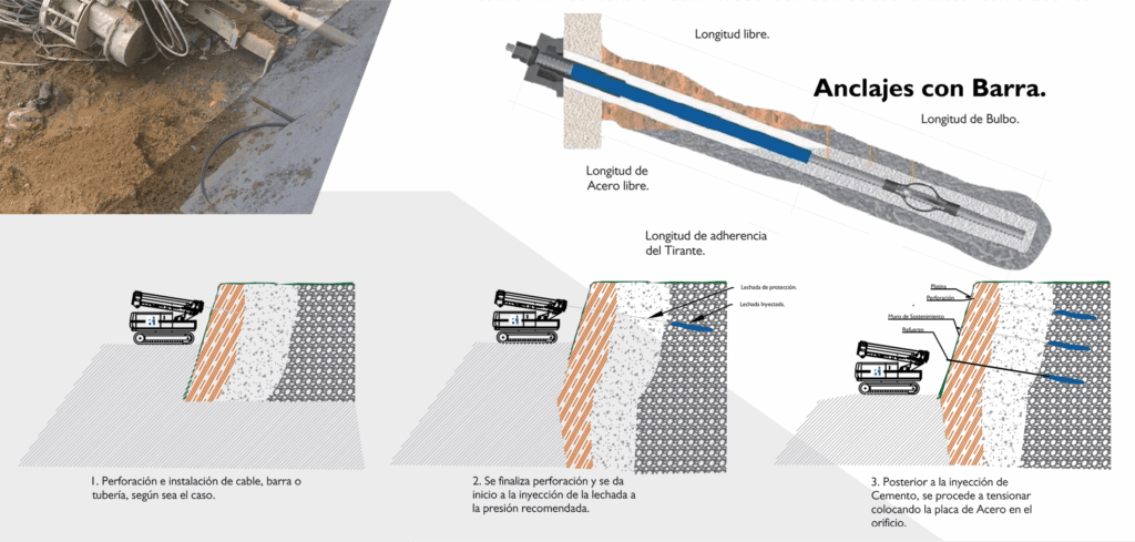 Los drenes, anclajes y bulones son elementos de estabilización que se instalan mediante perforaciones inclinadas en taludes, muros pantalla y estructuras de contención.